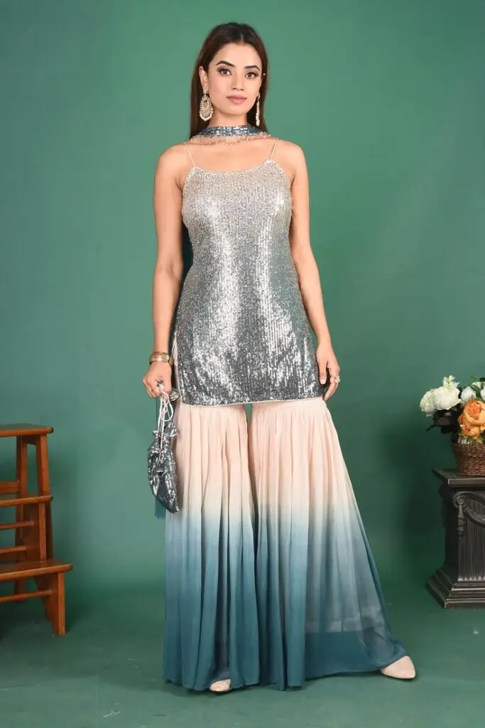 A gharara suit is another style of traditional South Asian women’s clothing, but it is less common than the first two. It consists of a regular kameez (shirt) for the top and bell-bottom-like pants. The pants are tight-fitting from the hip to the knee. Then become wide from the knee to the ankle.