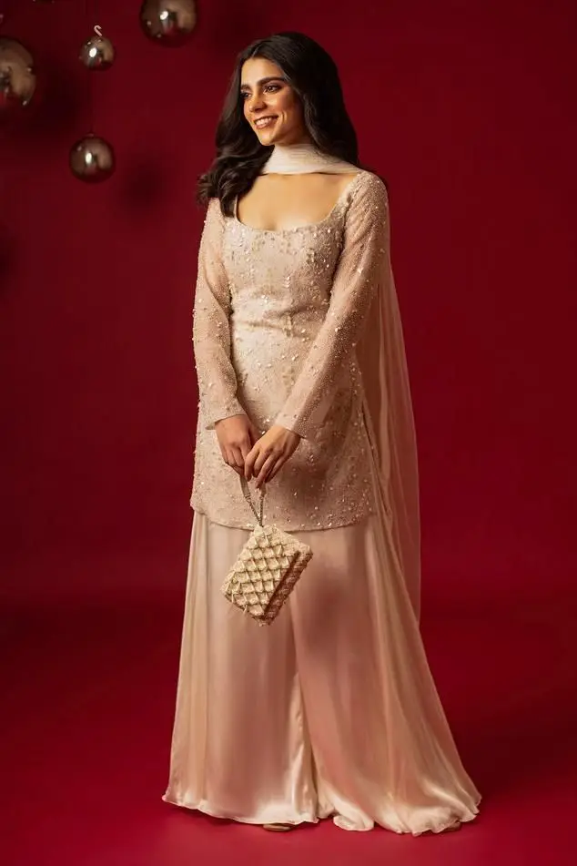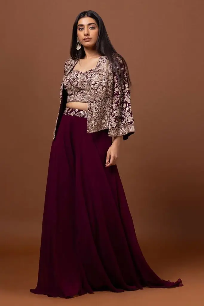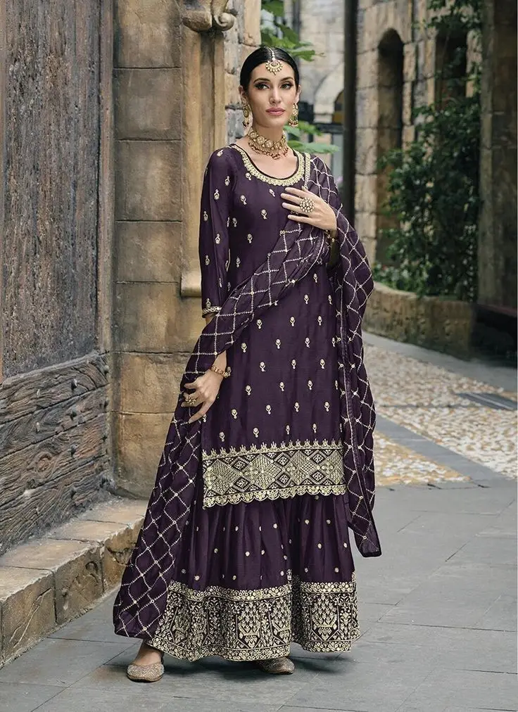 The Sharara suit features a flared, layered bottom paired with a short kameez. It’s a traditional yet trendy choice for weddings and special occasions.